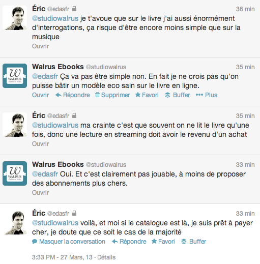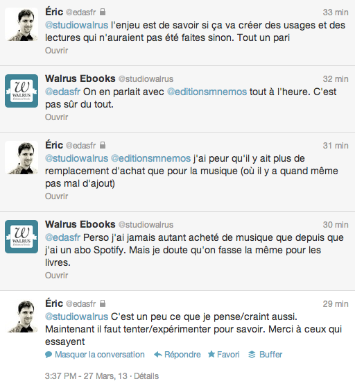 Difficile de comprendre dans ce cas pourquoi de grands éditeurs comme Dupuis se laissent embrigader dans l’affaire… Peut-être pour tester le service, ou essayer de nouveaux modèles. Mais lorsque les relevés de consultation arriveront, ils tomberont sans doute de haut. L’affaire Harmonia Mundi a fait du bruit, et certains éditeurs pourraient à leur tour être tentés de retirer leurs titres du catalogue.