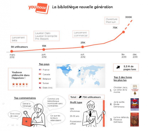 Selon les propres estimations de Youboox, le service aurait atteint 75.000 personne à février 2013, ne précisant pas s’il s’agit du nombre de téléchargements de l’application ou du nombre d’utilisateurs réellement actifs sur le système. Youboox revendique 5,5 millions de pages vues. Un objectif de 300.000 utilisateurs d’ici à décembre 2013 est évoqué.