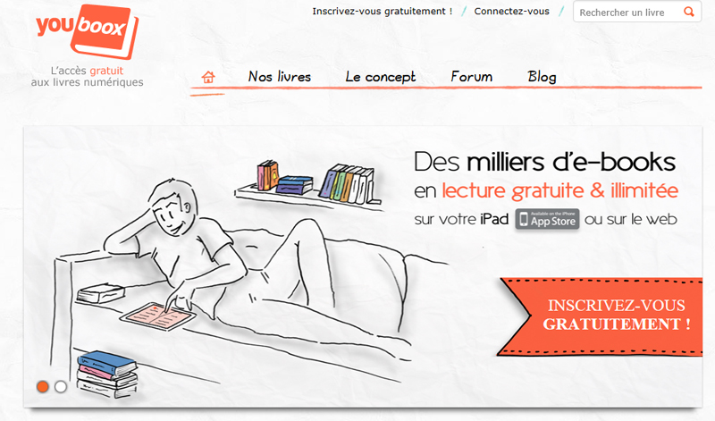 C’est désormais chose faite avec Youboox, qui propose globalement la même chose que Spotify: pour un abonnement de 9,99€ par mois, vous avez accès à un abonnement premium permettant de lire des livres via l’application de lecture, sur votre iPad par exemple. Bien entendu, tout comme ses petits cousins, Youboox permet de lire gratuitement: mais vous devrez « supporter » des bandeaux publicitaires durant votre consultation.