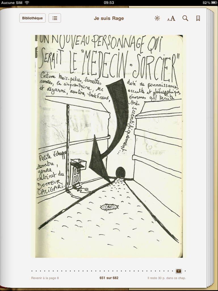 Enfin, dans les annexes de l’ouvrage, on pourra découvrir les photos des pages du carnet de notes fourni par Alverde, véritable mine d’idées et d’expérimentation contribuant à la genèse d’un roman tentaculaire comme « Je suis Rage ». Agrémenté de dessins, d’essais de rédaction et de plans dramaturgiques, les carnets sont lisibles dans leur présentation d’origine.